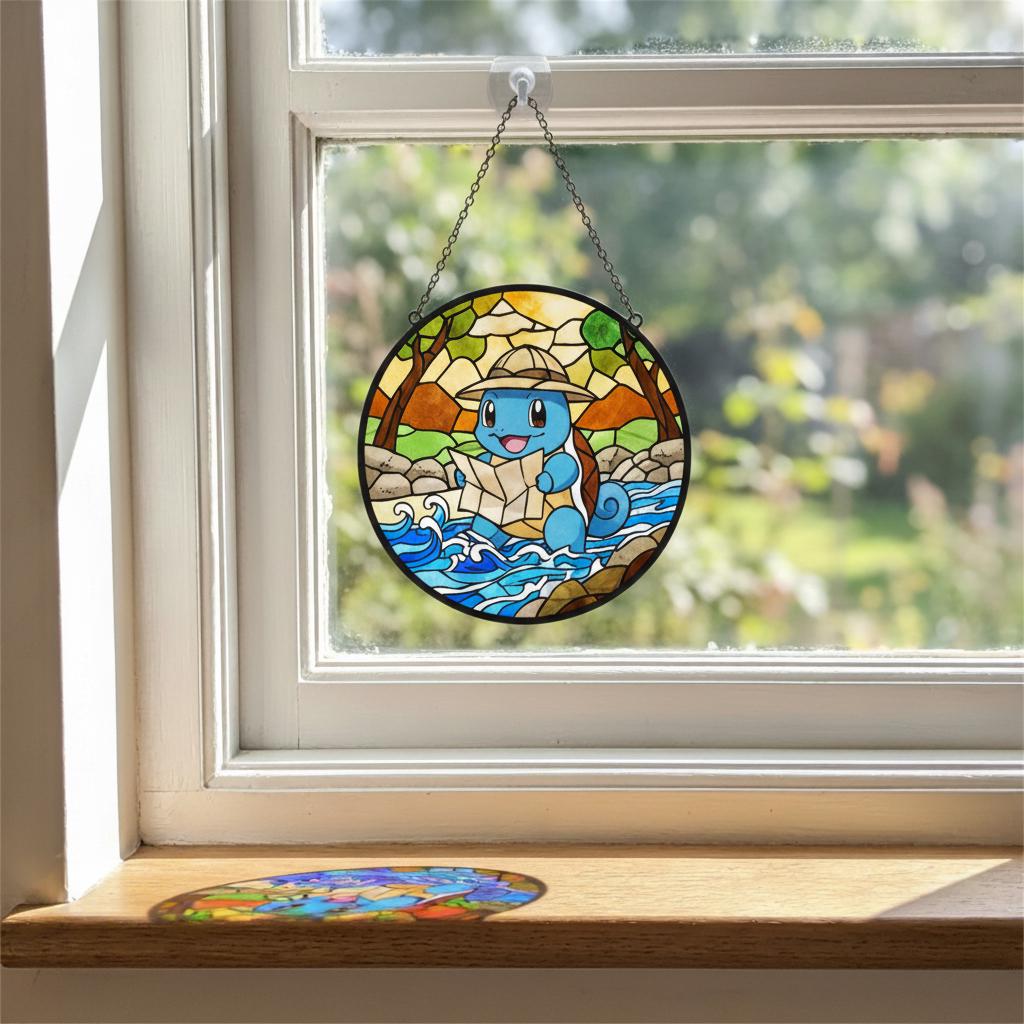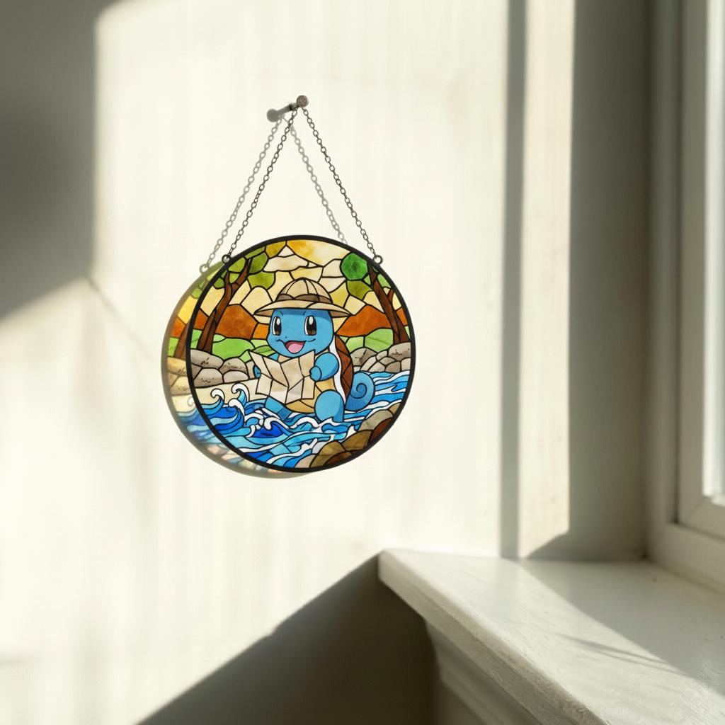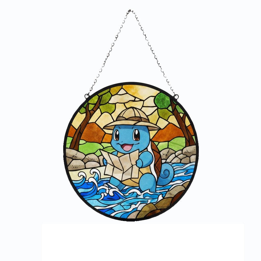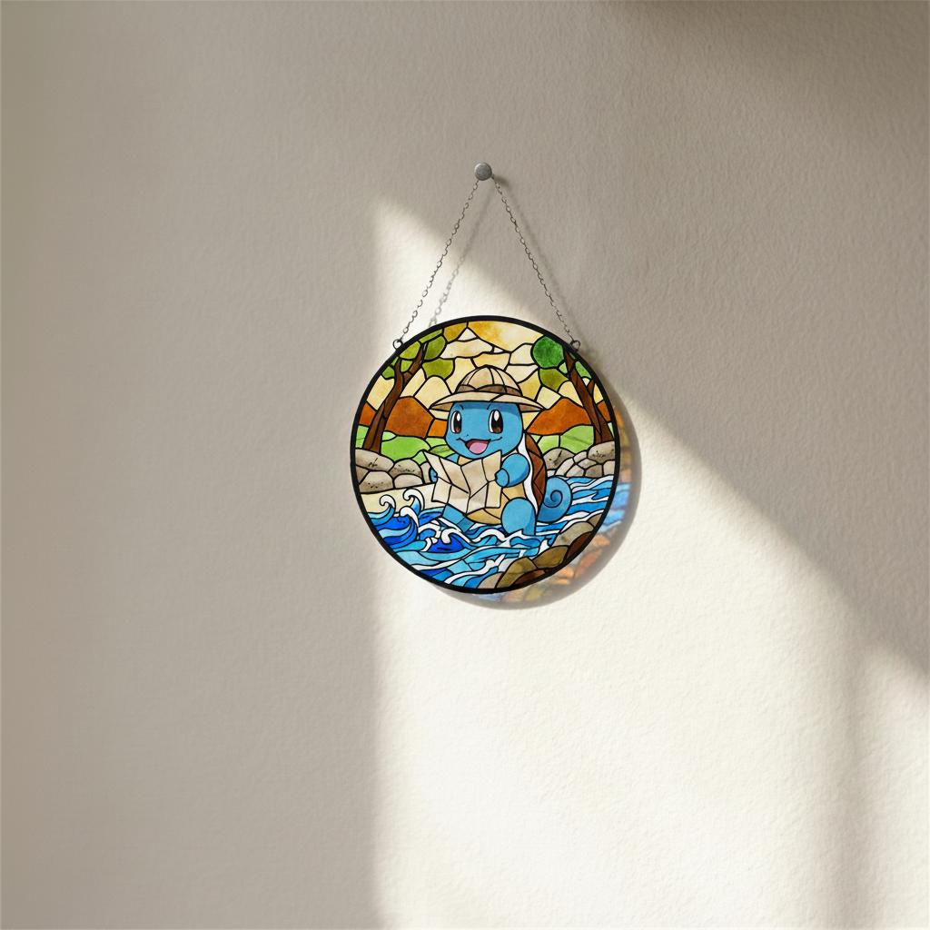 This stained glass pendant, inspired by an adventurous blue turtle character π’, captures an irresistibly cute exploration moment in vibrant, soothing glass. A plump blue explorer wearing a light brown hat happily clutches a map, eyes crinkled with delight, set against a lively backdrop of yellow-green forests, earthy rocks, and flowing blue wave patterns πΏπ. The gradient stained glass texture brings depth and calm to the scene, while black mosaic-style outlines echo the charm of vintage stained glass craftsmanship β¨. Securely packaged with custom foam padding and complete with a hanging chain, this piece is perfect for windowsill display. When sunlight filters through, warm yellow, teal, and lake-blue light spots ripple gently across the wall πͺπ, as if the tiny adventure world has stepped into your room. A delightful collectible for fans of cute character dΓ©cor, it also adds a playful, healing atmosphere to desks, bay windows, or cozy corners ππ.