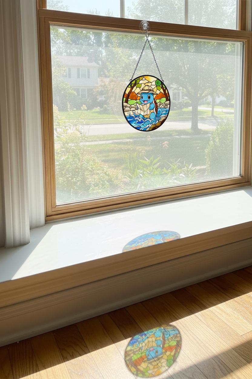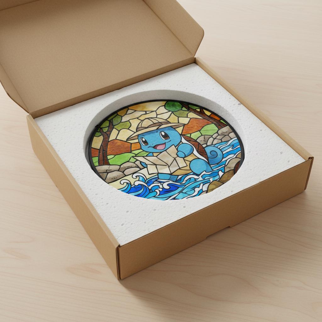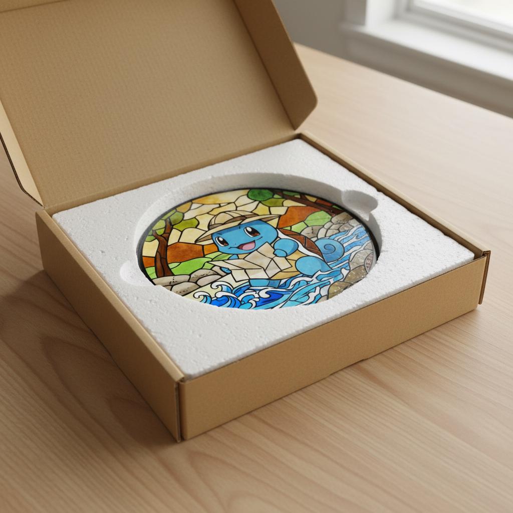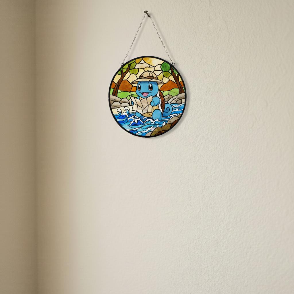 This stained glass pendant, inspired by an adventurous blue turtle character π’, captures an irresistibly cute exploration moment in vibrant, soothing glass. A plump blue explorer wearing a light brown hat happily clutches a map, eyes crinkled with delight, set against a lively backdrop of yellow-green forests, earthy rocks, and flowing blue wave patterns πΏπ. The gradient stained glass texture brings depth and calm to the scene, while black mosaic-style outlines echo the charm of vintage stained glass craftsmanship β¨. Securely packaged with custom foam padding and complete with a hanging chain, this piece is perfect for windowsill display. When sunlight filters through, warm yellow, teal, and lake-blue light spots ripple gently across the wall πͺπ, as if the tiny adventure world has stepped into your room. A delightful collectible for fans of cute character dΓ©cor, it also adds a playful, healing atmosphere to desks, bay windows, or cozy corners ππ.